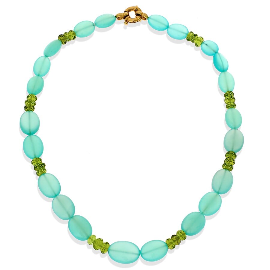 A splashy necklace crafted from smooth blue-green chalcedony and lush faceted peridot beads. Necklace fastens with an 18k yellow gold bolt clasp. Handmade in America.