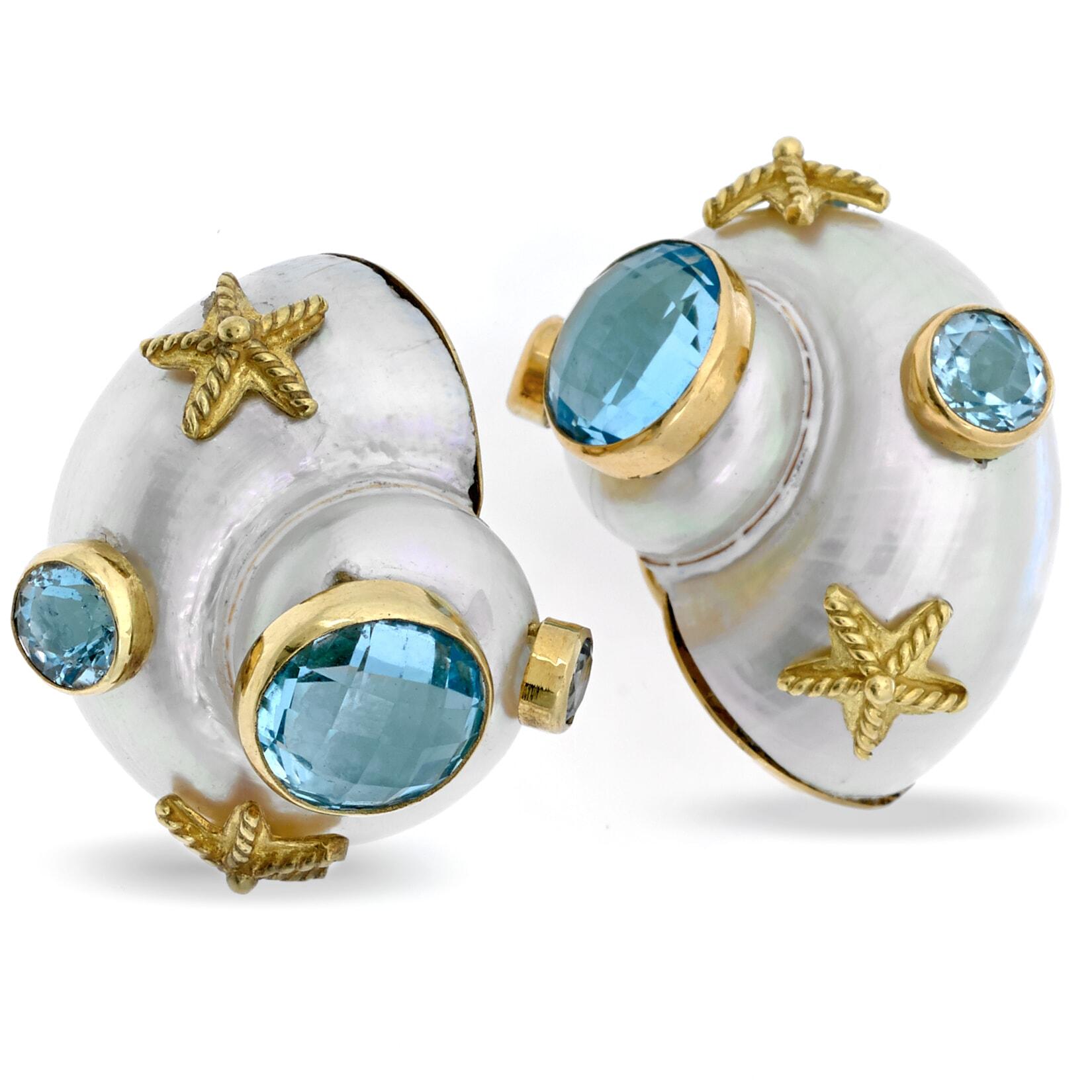 Gorgeous natural nautilus shell earrings are enhanced with 18k yellow gold settings holding blue topaz bevel-set stones. Starfish are handcrafted out of gold with rope twist detailing. Handmade in America.