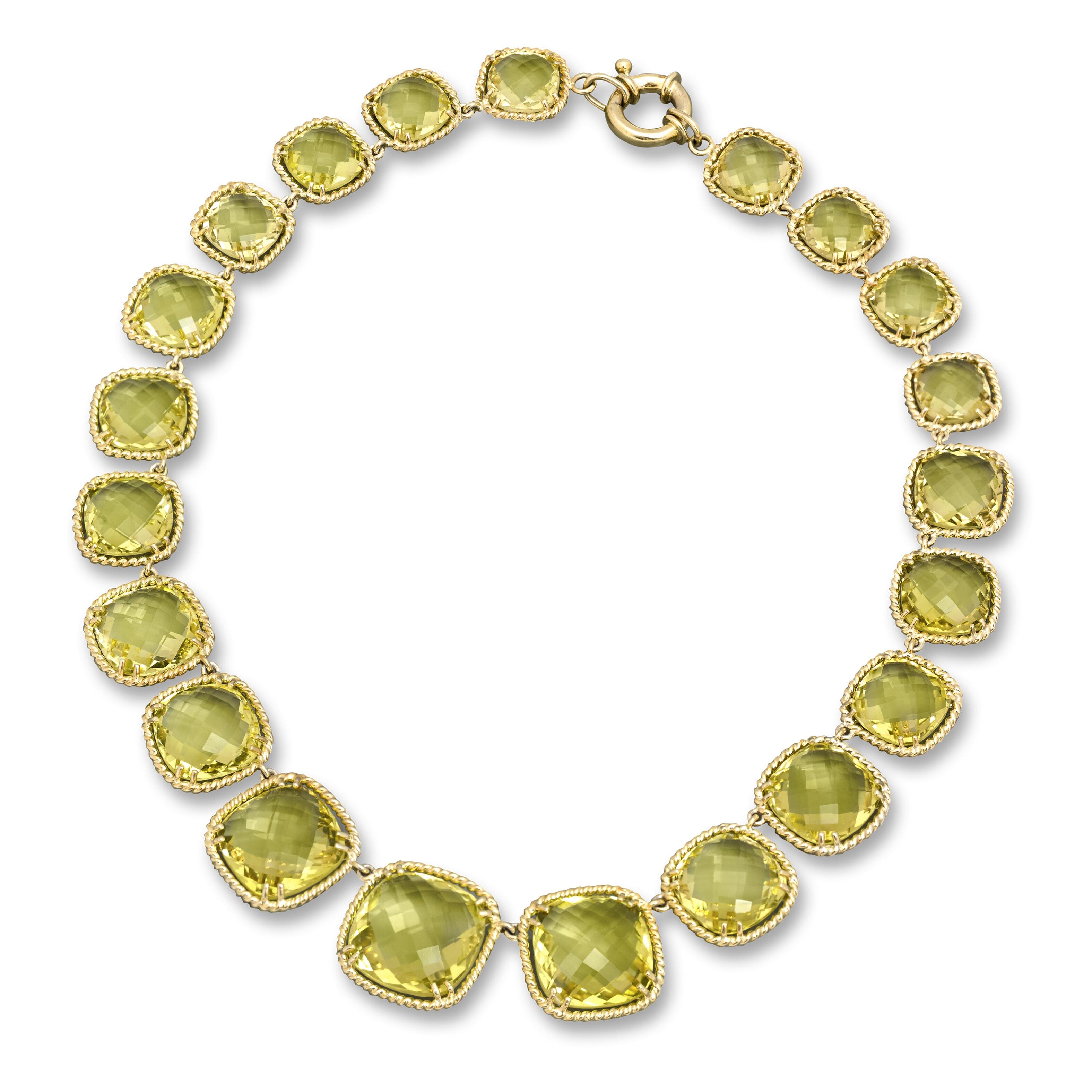 Graduating cushion briolette lemon quartz set into 18k yellow gold with twist rope borders. Stones range from 12mm to 20mm square (200 cts). Handmade in America. Exclusively at Scully & Scully.