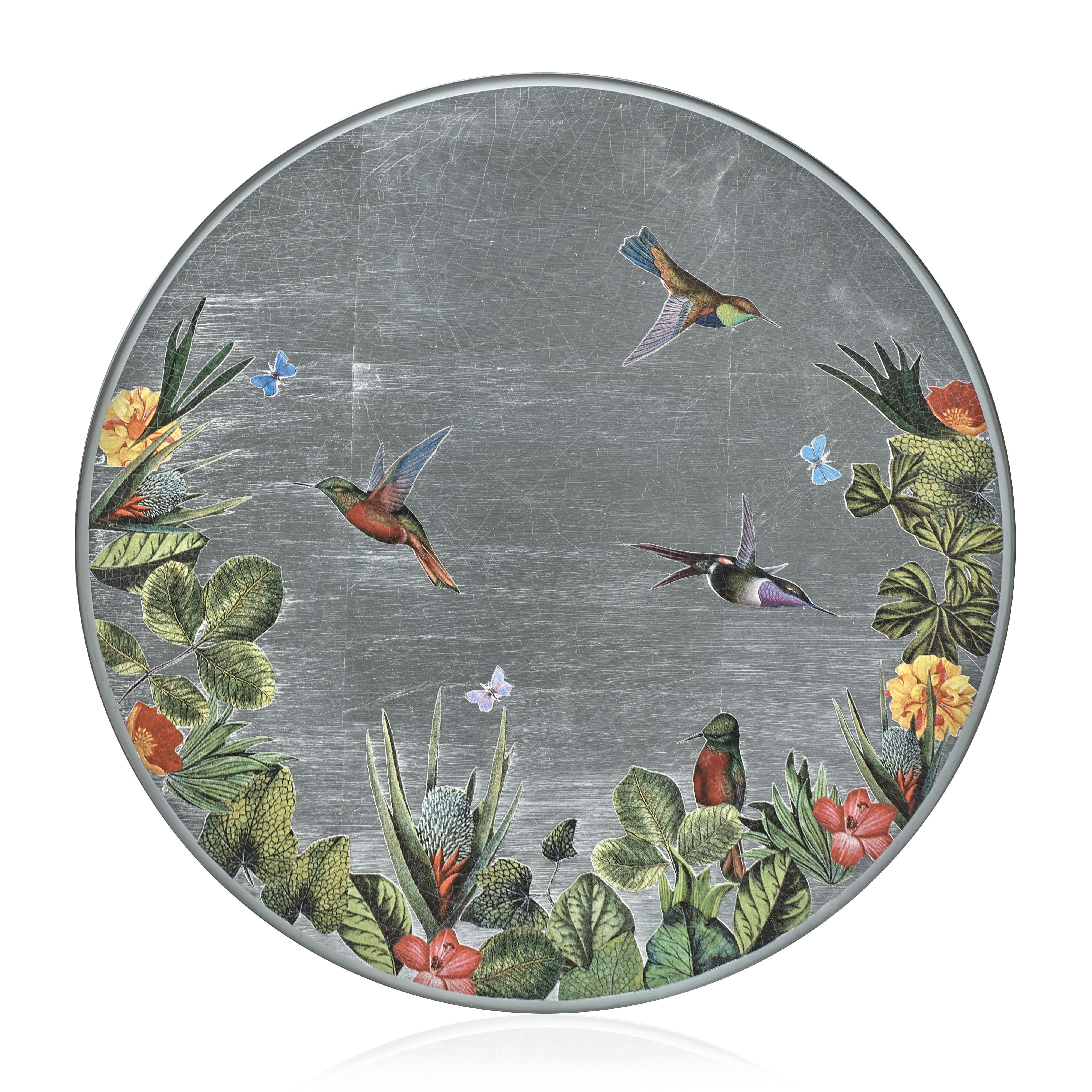 This large round centre piece will look fabulous in the centre of a table for serving dishes, vases, drink jugs, and glasses for indoor and outdoor dining/drinks party or purely to add luxury, colour, and style to your home. Made from 6mm polished glass, crackled with gold or silver. Decoupage design, painted, gold or silver leaf background colour, edged with gold or silver and protected with black felt. Handmade in England.