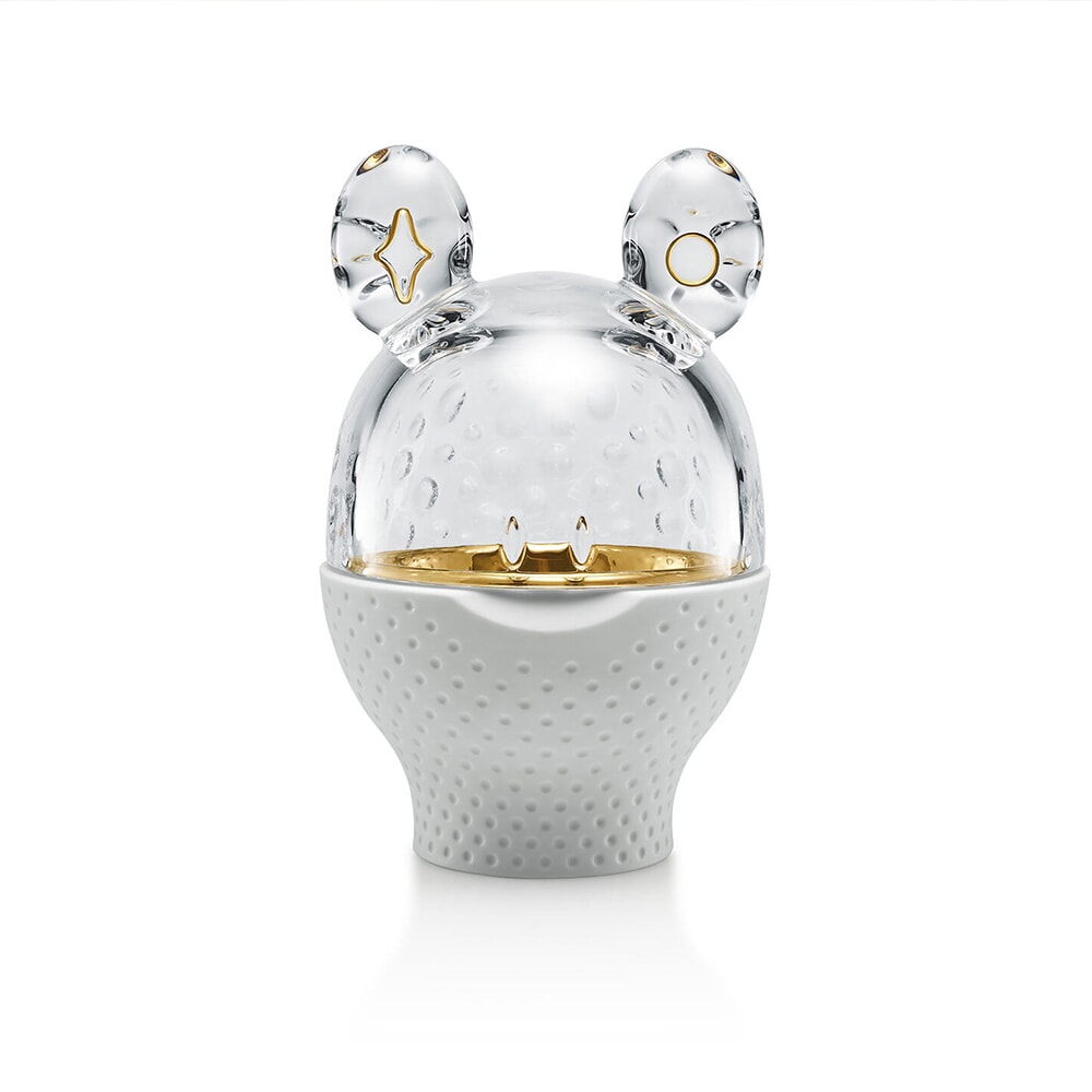 Jaime Hayon's creativity is limitless. Hand in hand with the craftsmen of the manufacture, he continues his exploration of crystal. With its big eyes placed on the top of the head, the funny creature will bring good humor into the house. Composed by a crystal cover and a porcelain base by Lladro, the animal is delicately gilded and cut to create beautiful reflections of light.