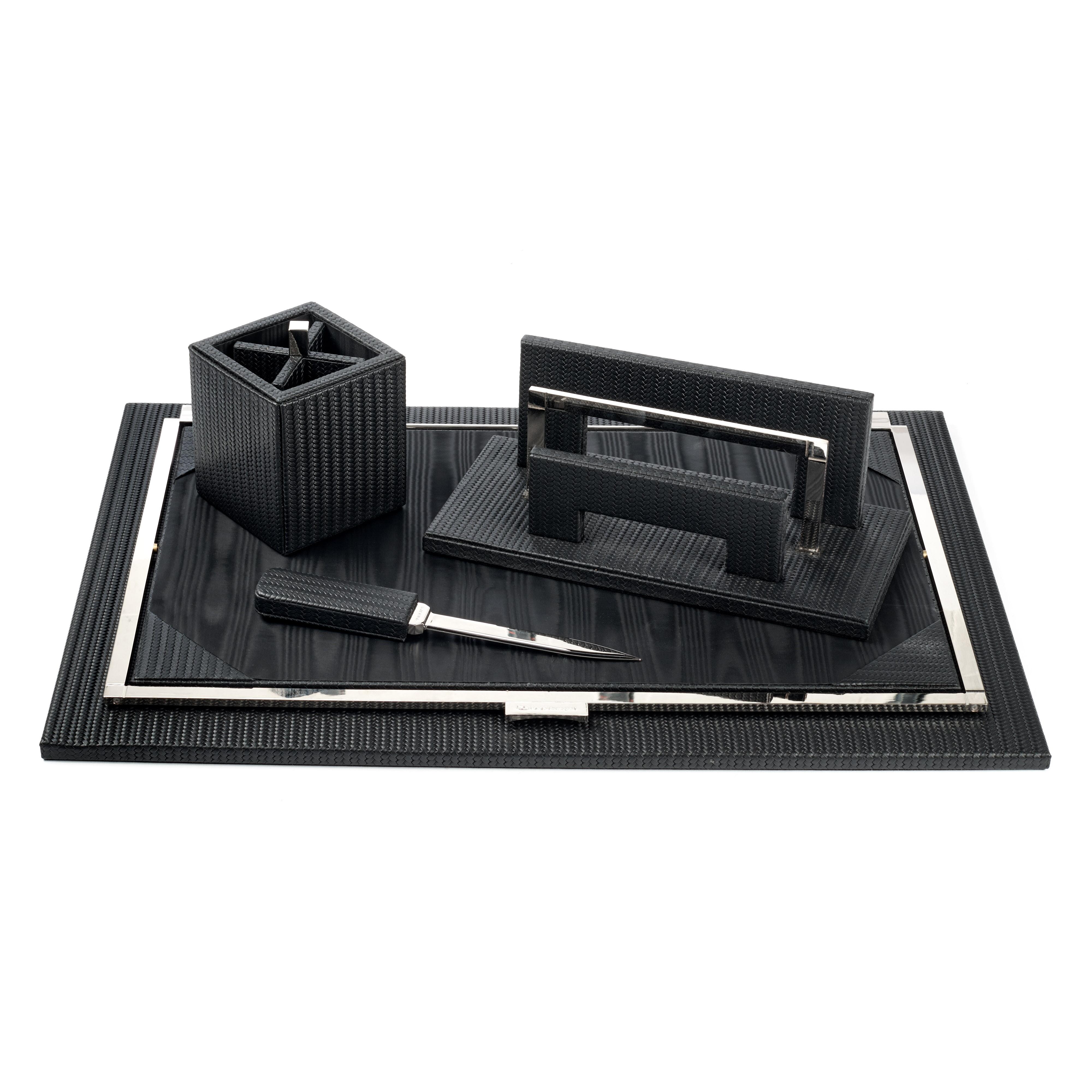Stylish leather desk set is in braided black leather resulting in a handsome yet efficient desk set. Each piece is handmade of fine calf leather with suede undersides protecting your surfaces. Handmade in Italy. Exclusively at Scully & Scully.