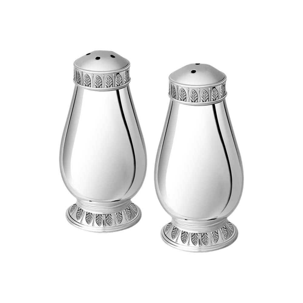 Silver-plated salt and pepper shakers in the Malmaison pattern. Malmaison is the ultimate Empire provincal collection. It is named after the castle which was a favorite vacation spot for Emperor Napoleon Bonaparte and Empress Josephine. Its adornment entails illustrations of water leaves and lotus flowers. The symmetrical structure of the decor is typical of the Empire style.