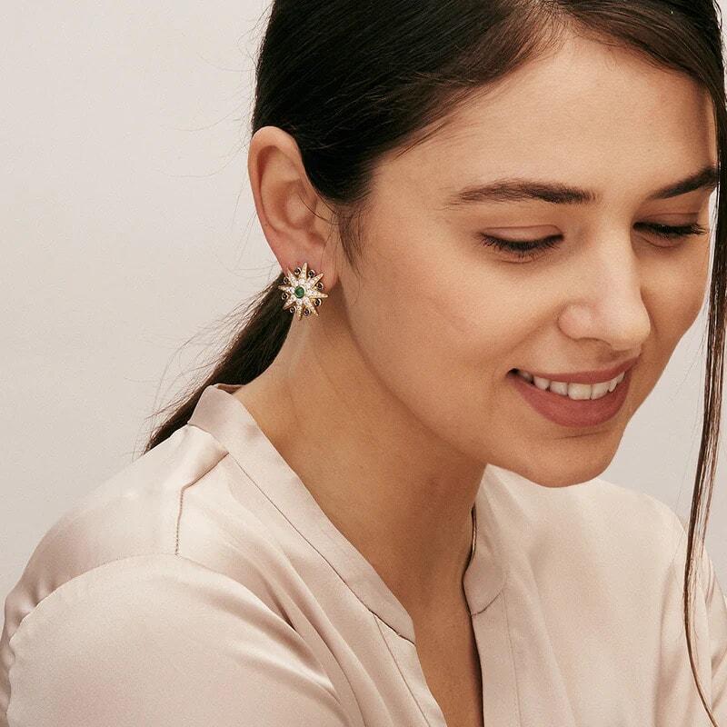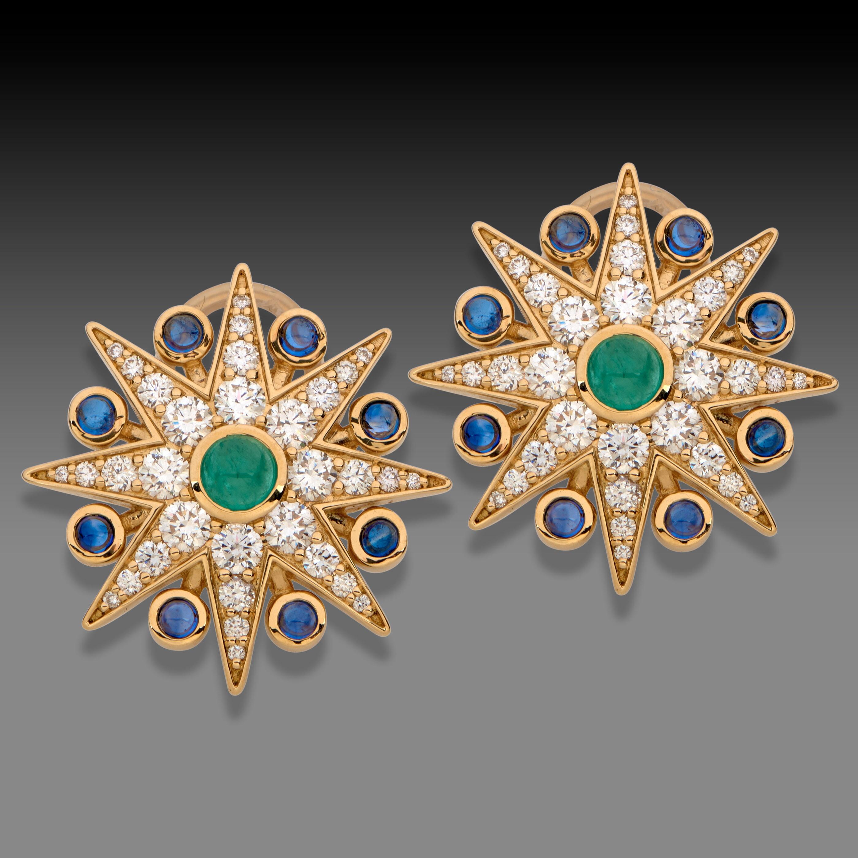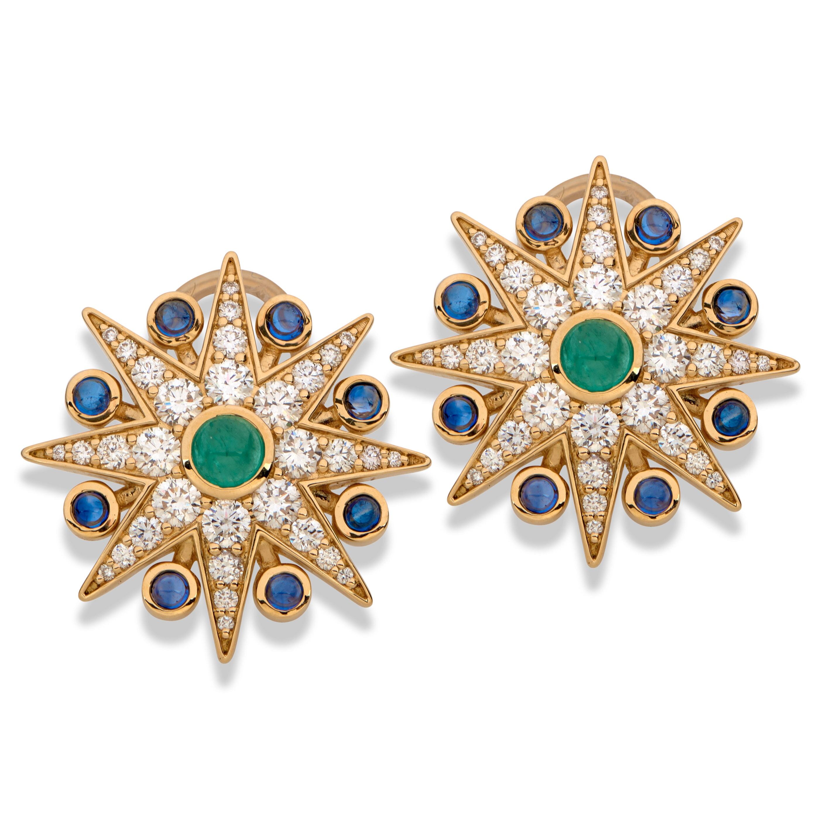18k gold frames the 0.4 tcw emeralds, 0.8 tcw blue sapphires, and 1.7 ct diamonds of these stunning earrings. The sunburst shape of the cosmic earrings gives these earrings their name, and the stunning colors go well with a variety of outfits and settings. Available in clips and posts.