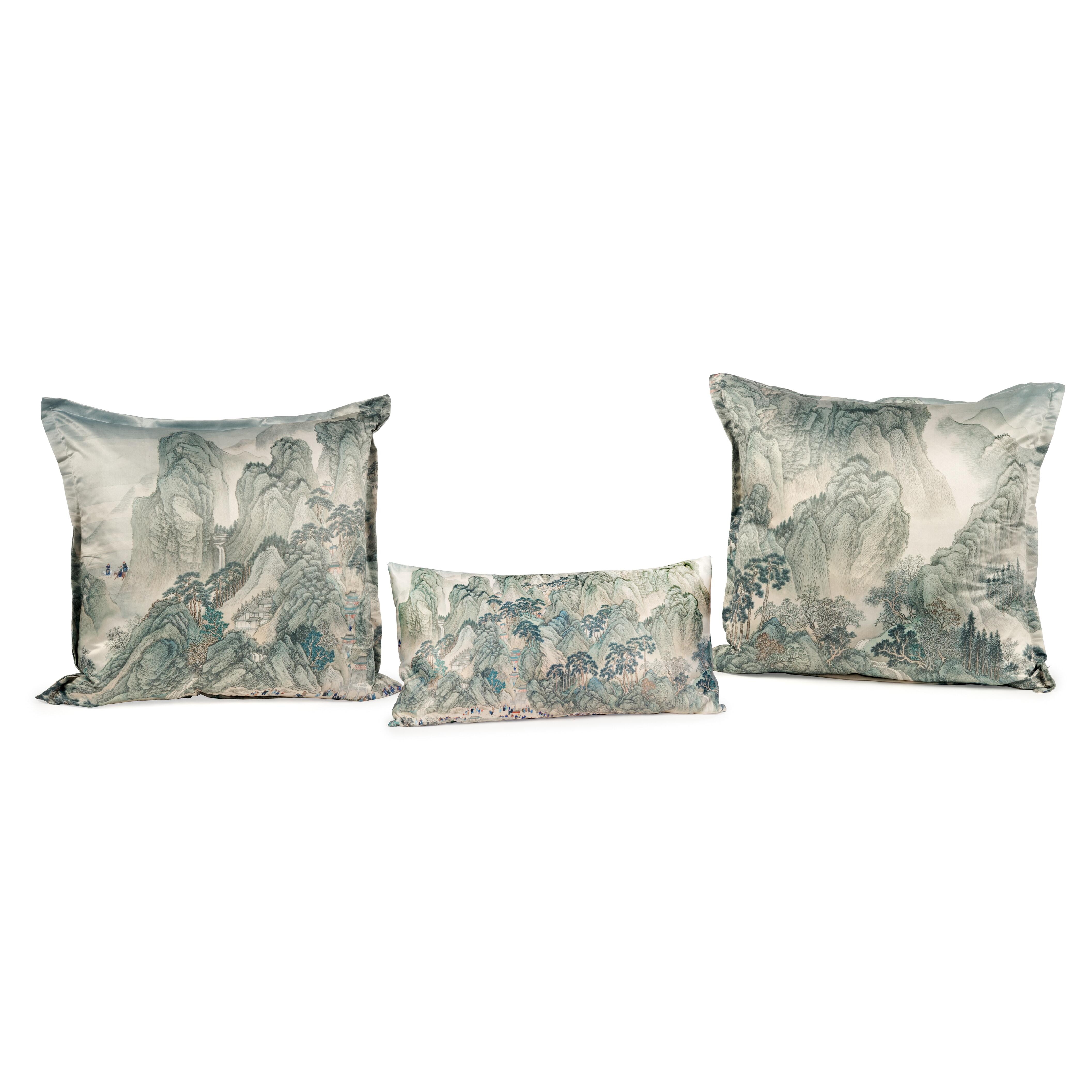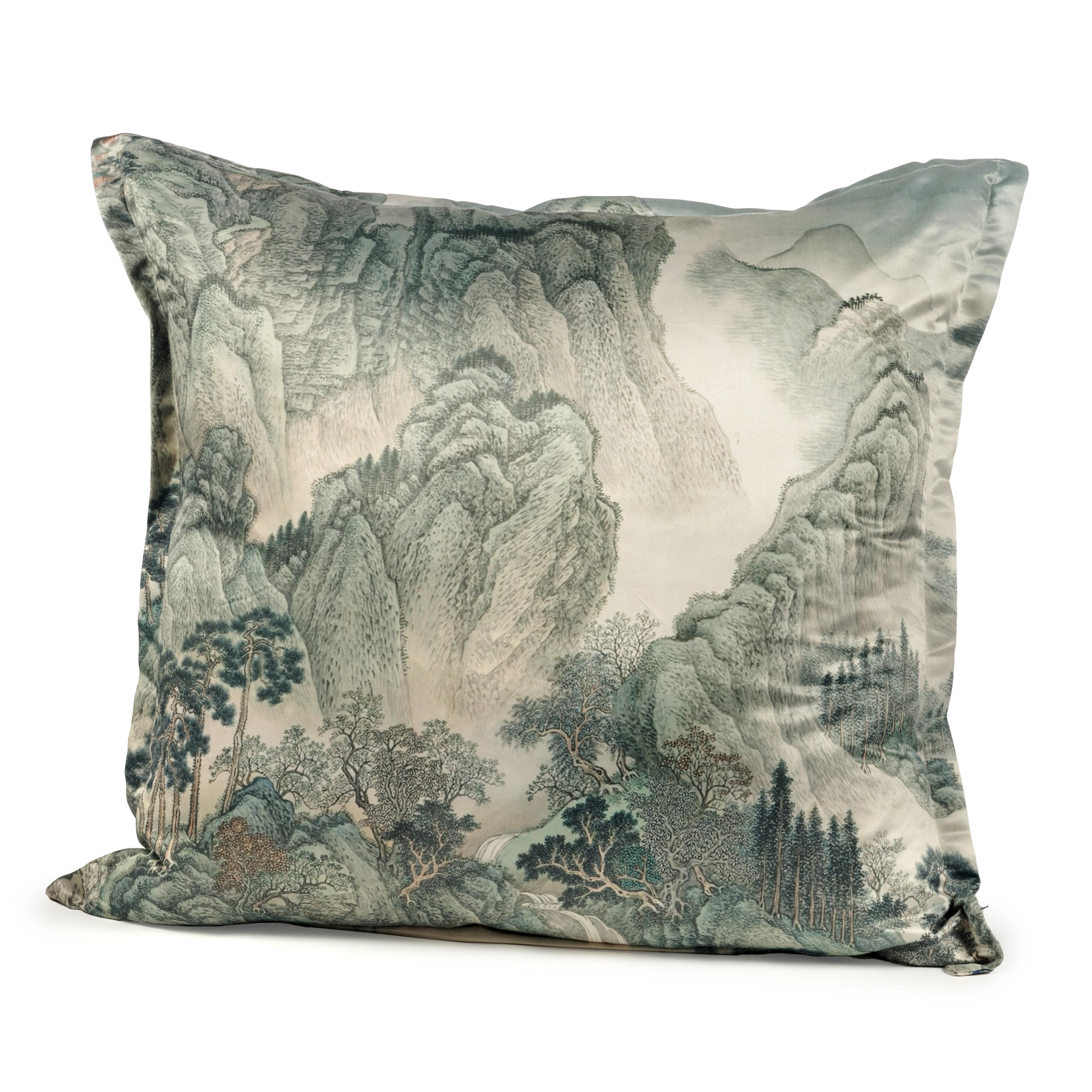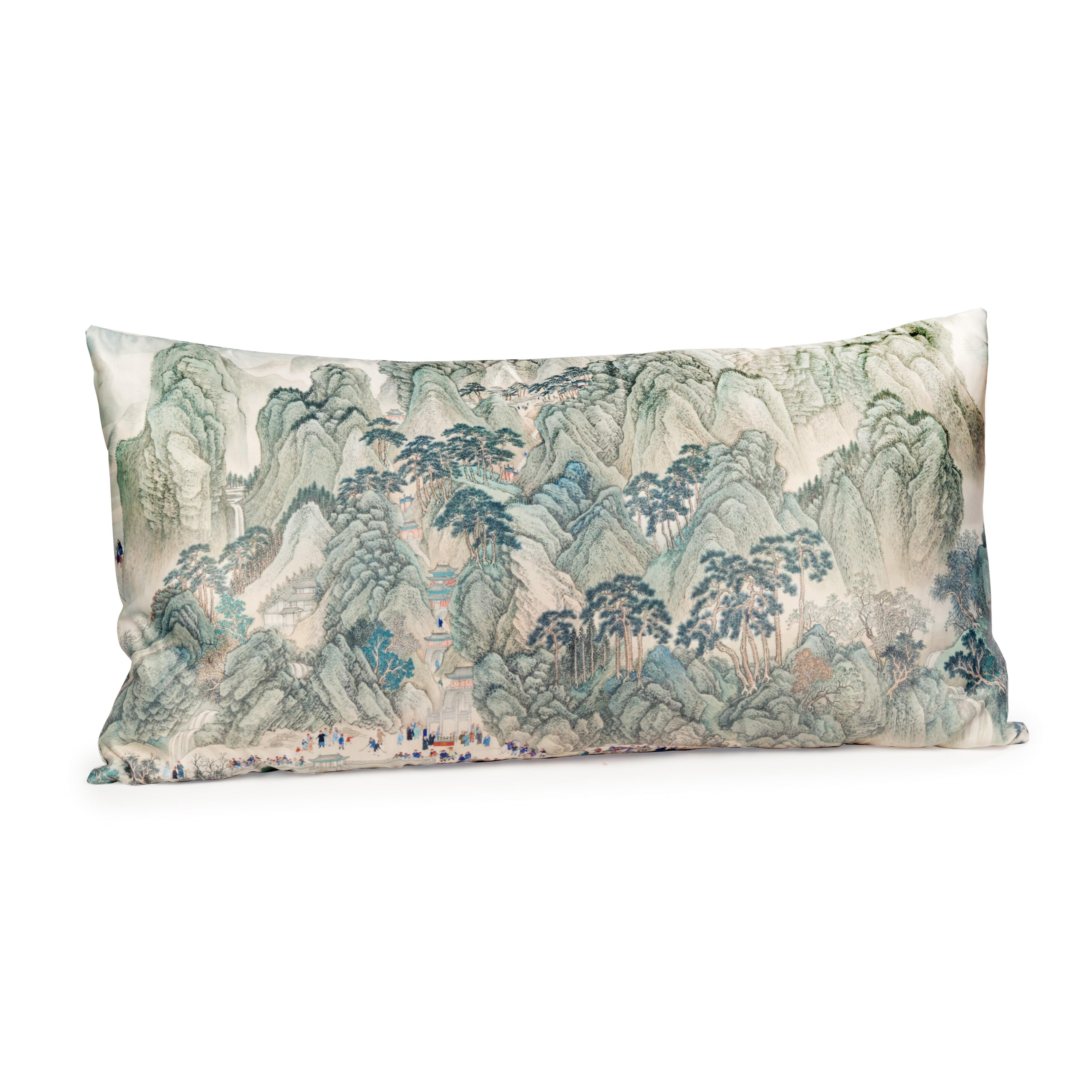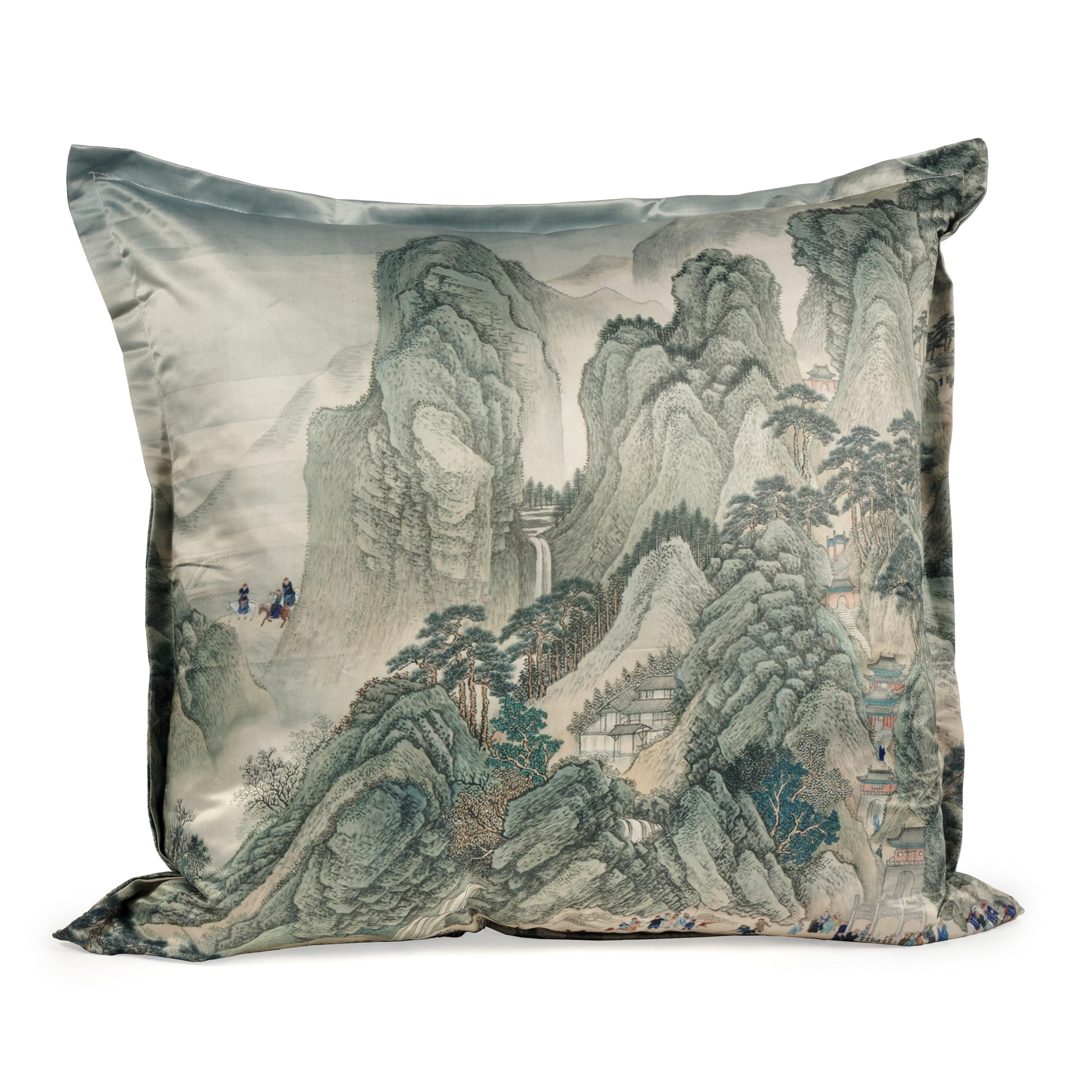 Pillows capture the procession of a Chinese emperor to a mountaintop village surrounded by picturesque peaks. Printed on the front and back on silky cotton fabric. Fade resistant from exposure. Edges are knife edge finished and an invisible zipper enclosure is included at the bottom.