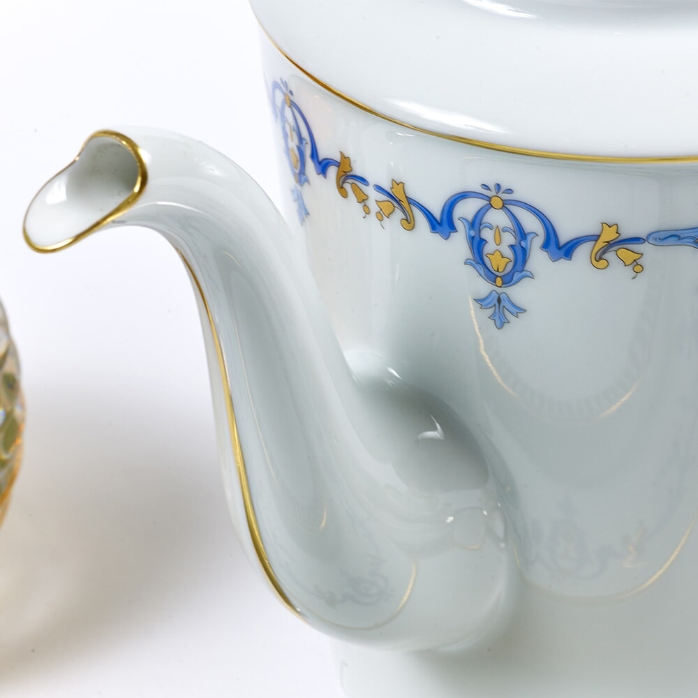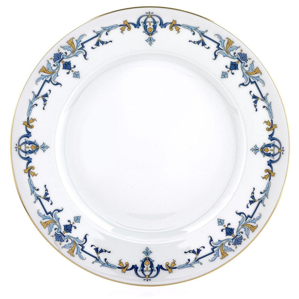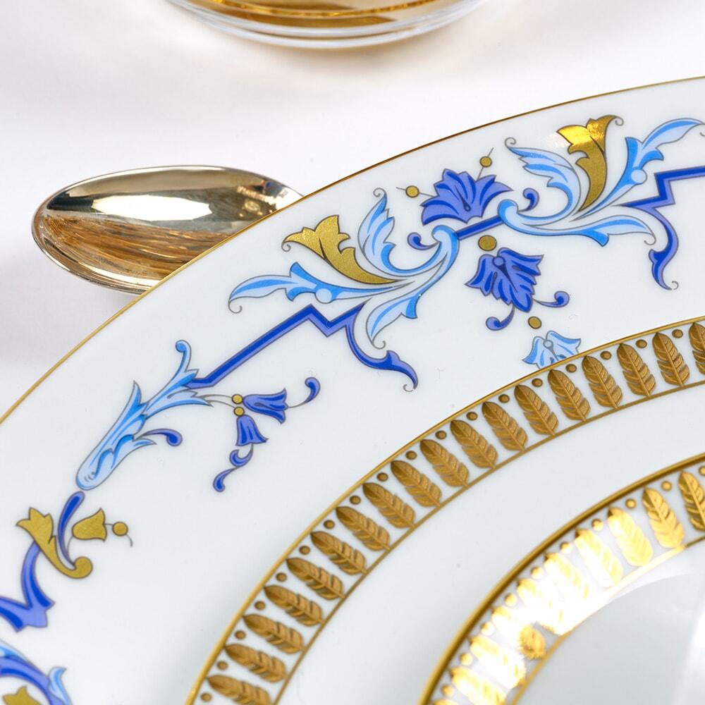 Elegant Marthe is hand-decorated with a Louis XIV-style trim in blue and gold, inspired by "Martha," the dinnerware ordered by Cesar Ritz in 1898 for the grand opening of the Paris Ritz Hotel. Delicate scrolls and foliage adorn the the border of each Limoges porcelain piece with handpainted 22k gold. Handmade in France.