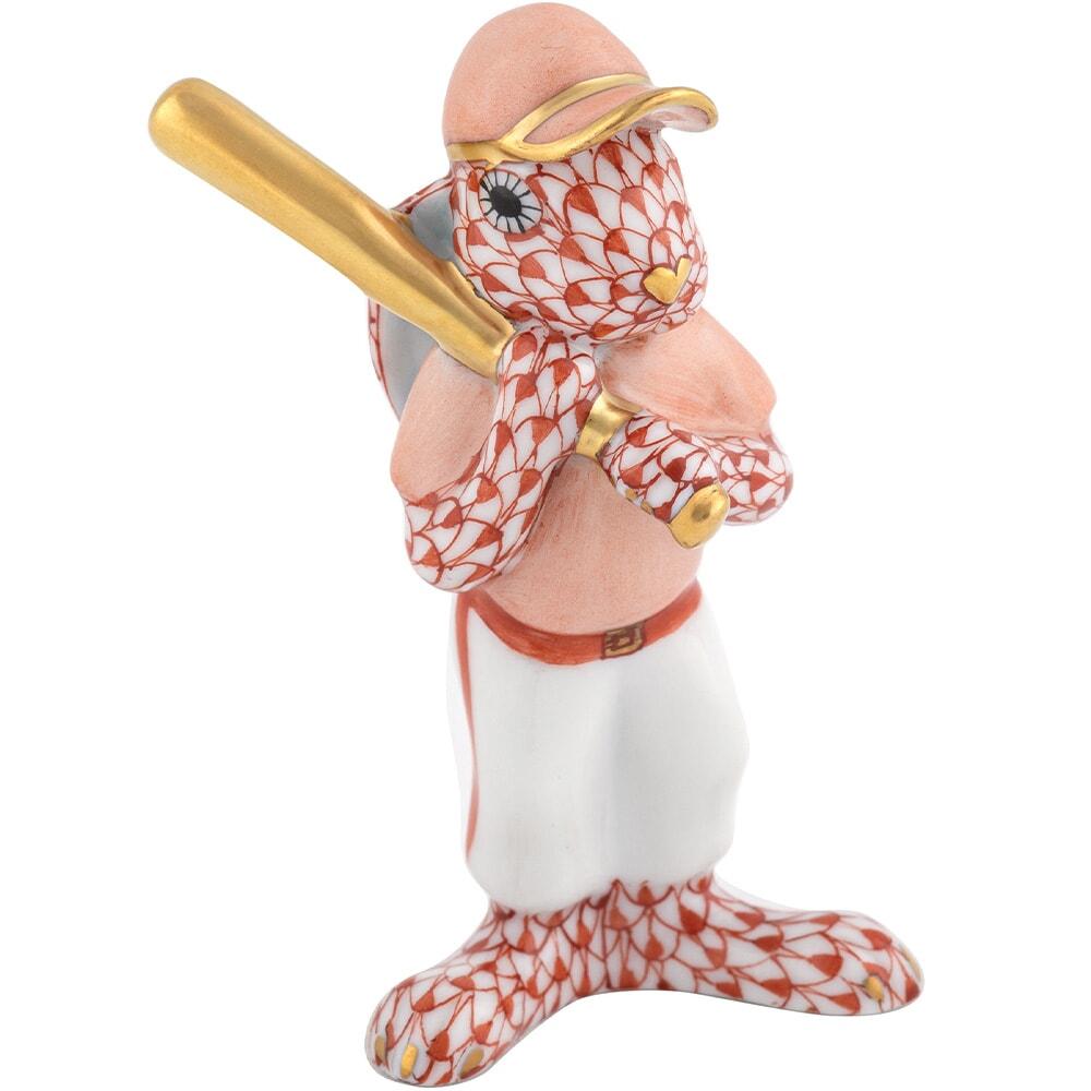 Batter up! Introducing the Herend Baseball Bunny, adorned in the traditional jersey and cap with the accompanying bat. Handmade and handpainted porcelain from Hungary, enhanced with 24k gold accents.