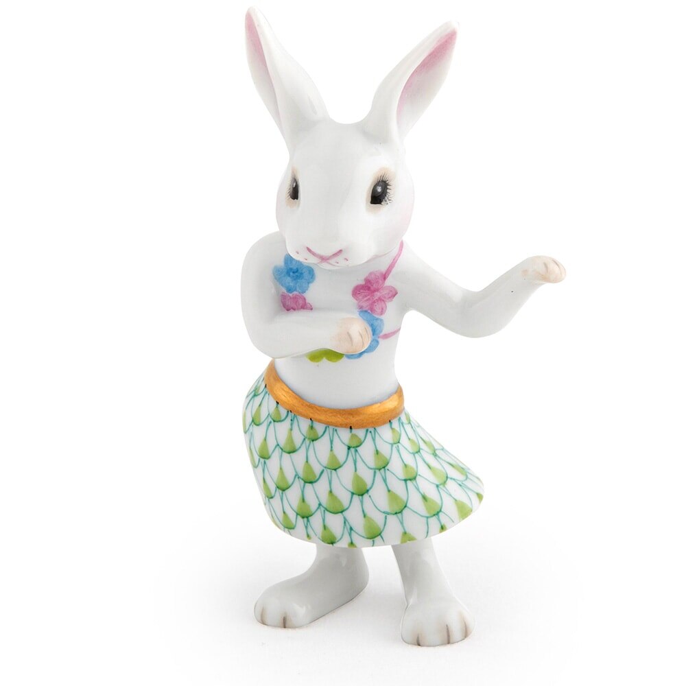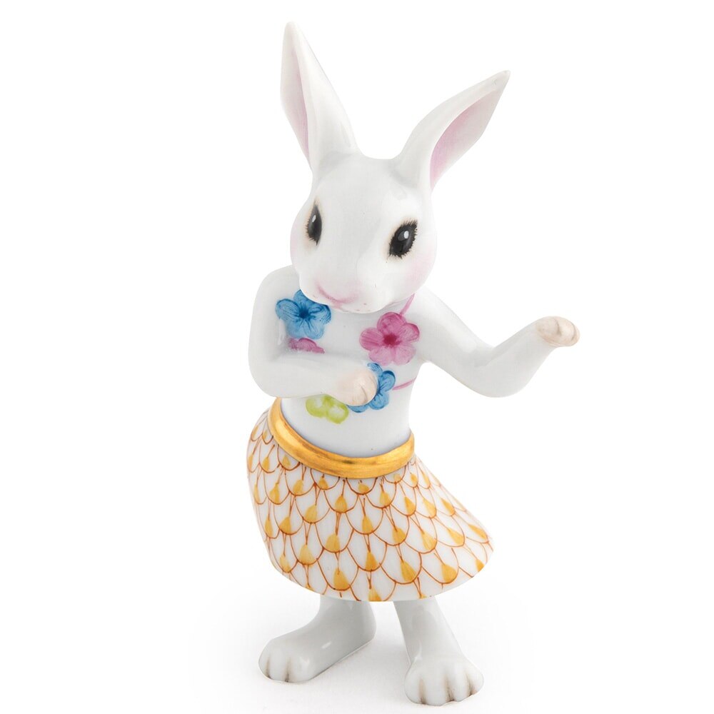 A whimsical hula bunny from Herend dons the traditional hula skirt and, of course, iconic lei of Hawaii. Handmade and handpainted porcelain from Hungary, with 24k gold accents.