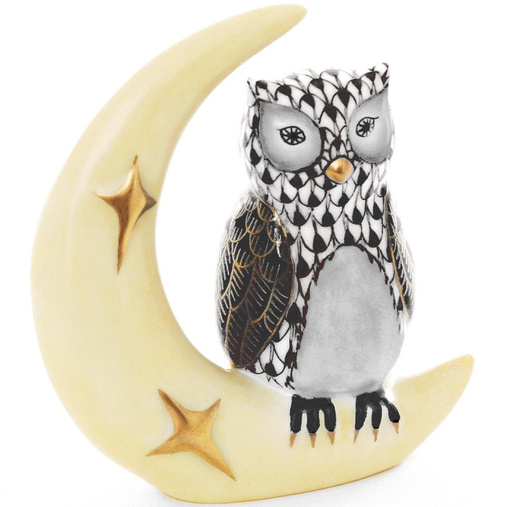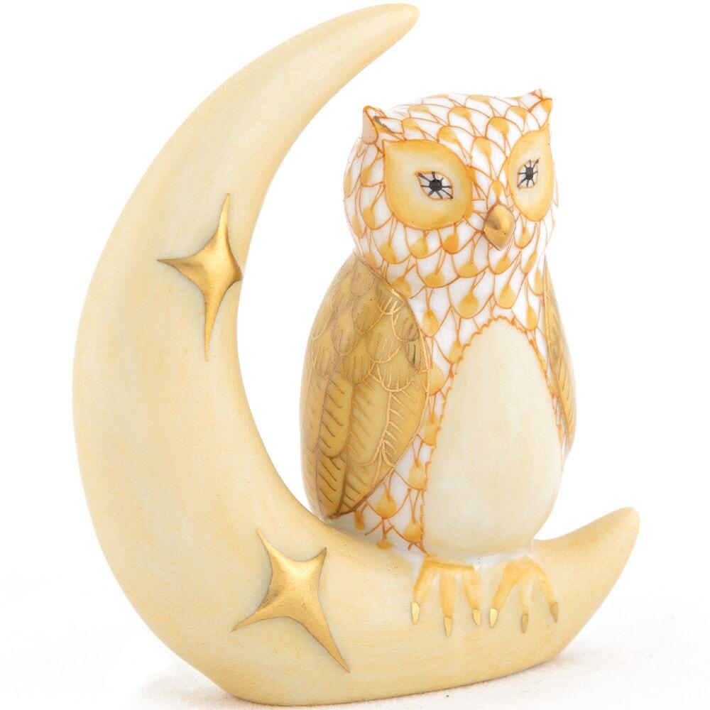 The iconic owl gets a Herend makeover in traditional fish net pattern, standing out proudly as he rests on a crescent moon and surveys his surroundings. Handmade and handpainted porcelain from Hungary, with 24k gold accents.