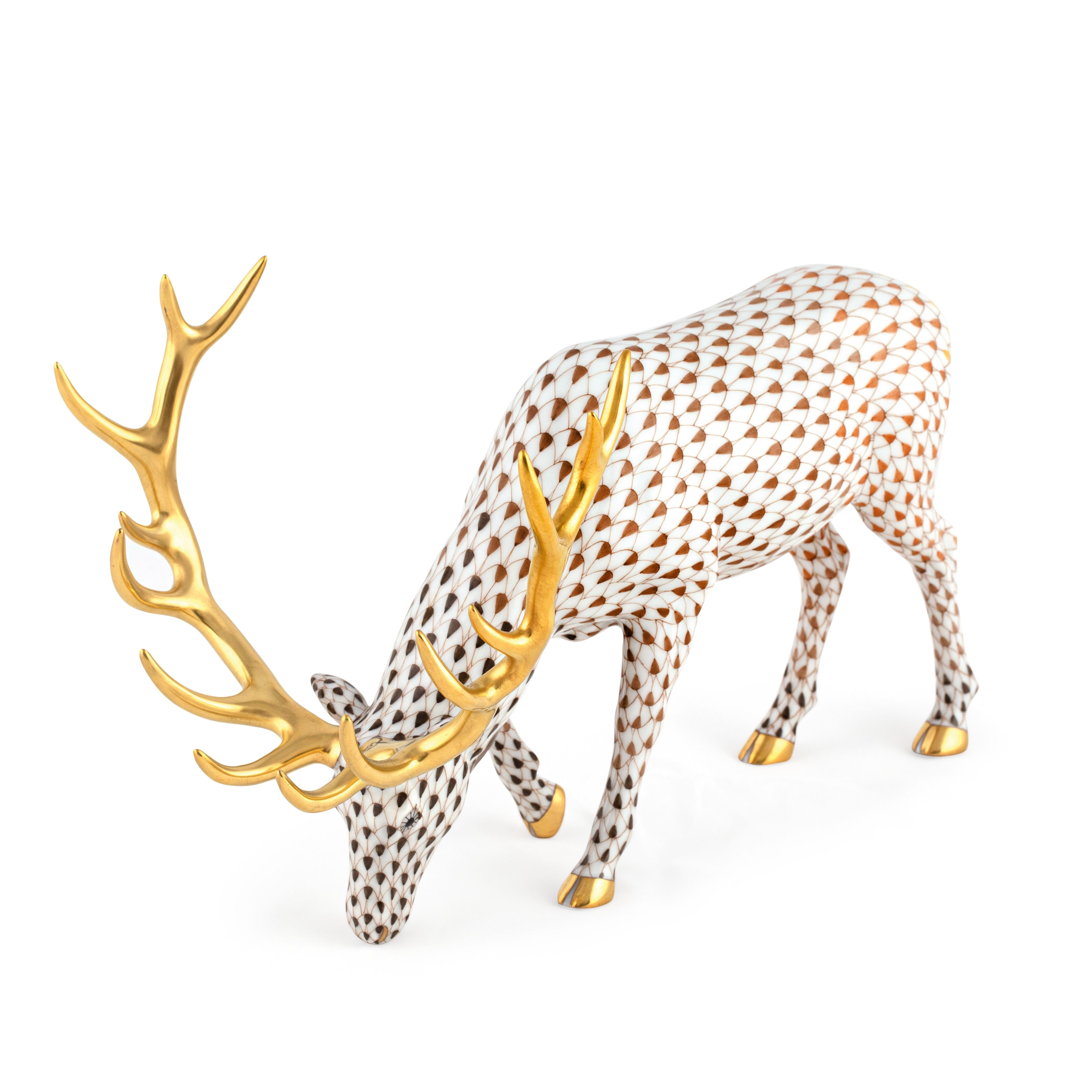 New for 2022, the Reserve Olympic Elk from the elite porcelain manufacturers at Herend is a masterwork of studious precision and artist inspiration. Notice the subtle ambiguity imbued in the majestic elk's pose; it is open to the viewer's personal interpretation whether they are witnessing the simple act of grazing or a sign of humility in the form of a gestural bow. Featuring the classic Herend fish scale pattern and beautifully rendered golden antlers, the Olympic Elk truly contains the epic spirit of the titular athletic ceremony. Limited edition of 150.