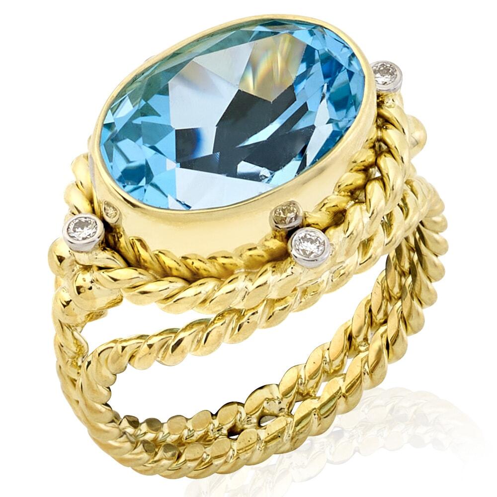 18K Yellow Gold Swiss Blue Topaz Cab & Diamond Twist Rope Ring