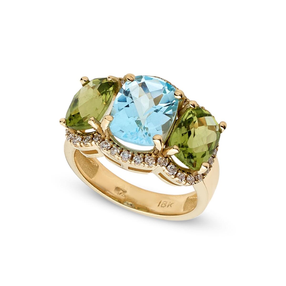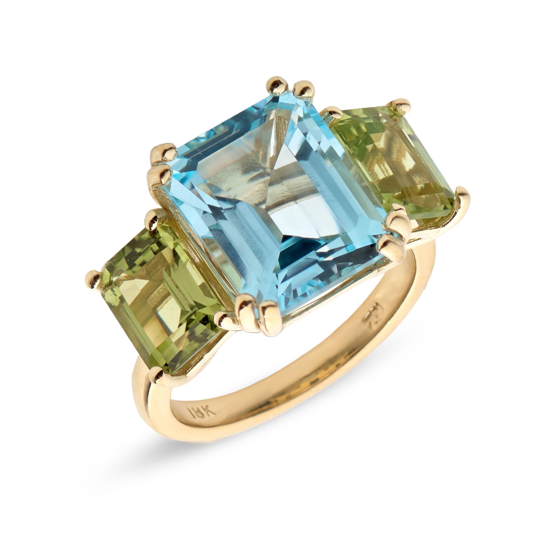 18k Yellow Gold Three Stone Sky Blue Topaz Center Peridot Sides Ring