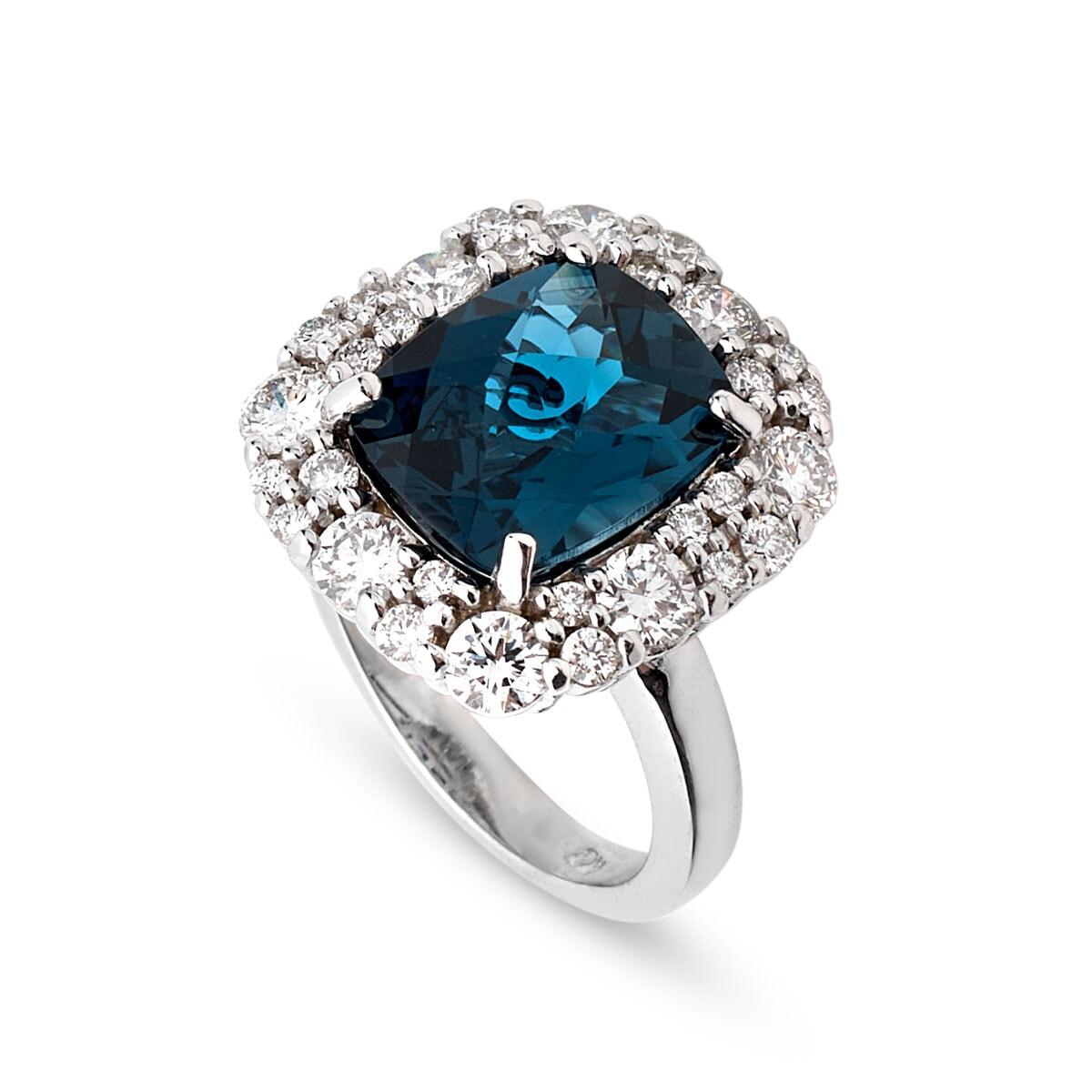 18k White Gold London Blue Topaz Square Diamond Halo Ring