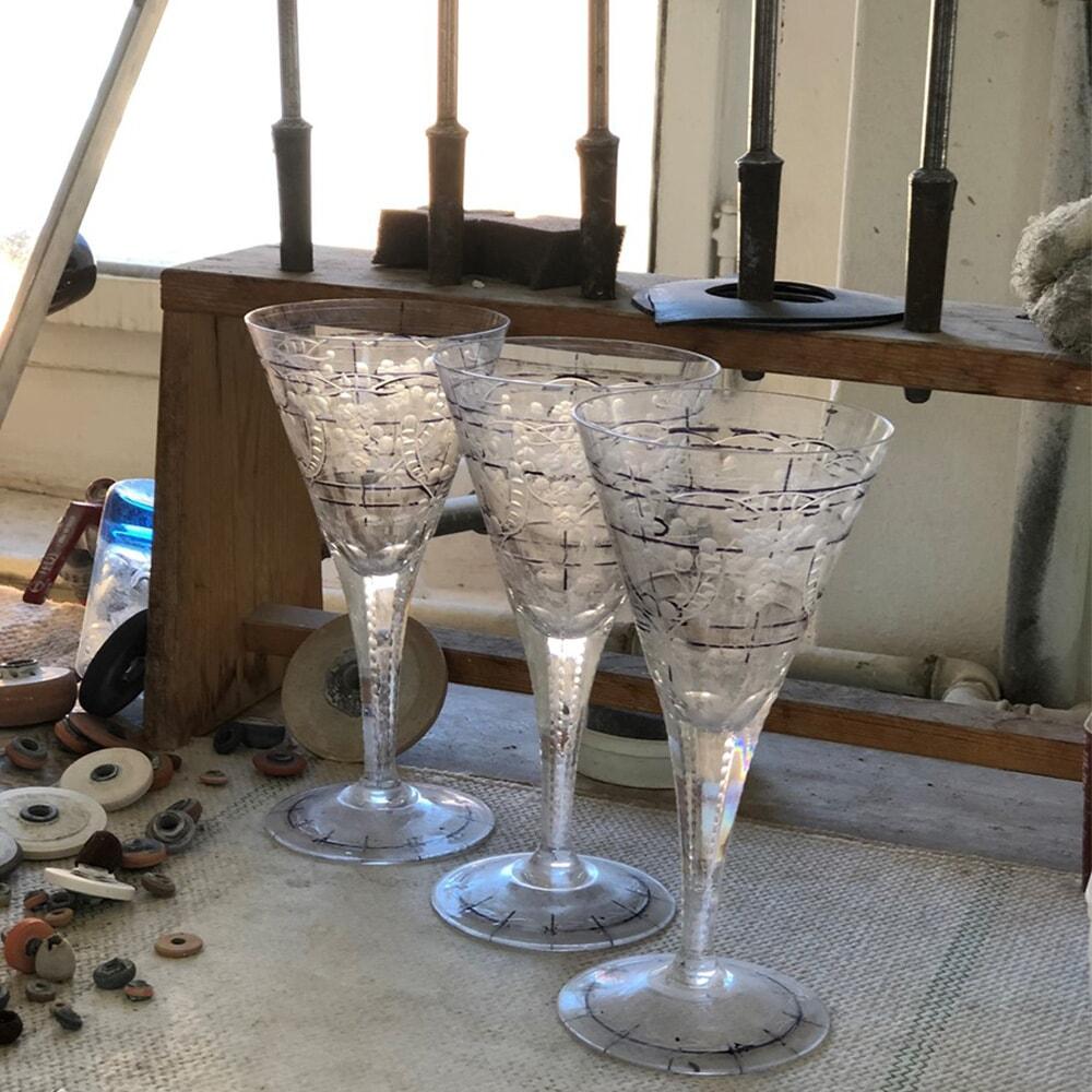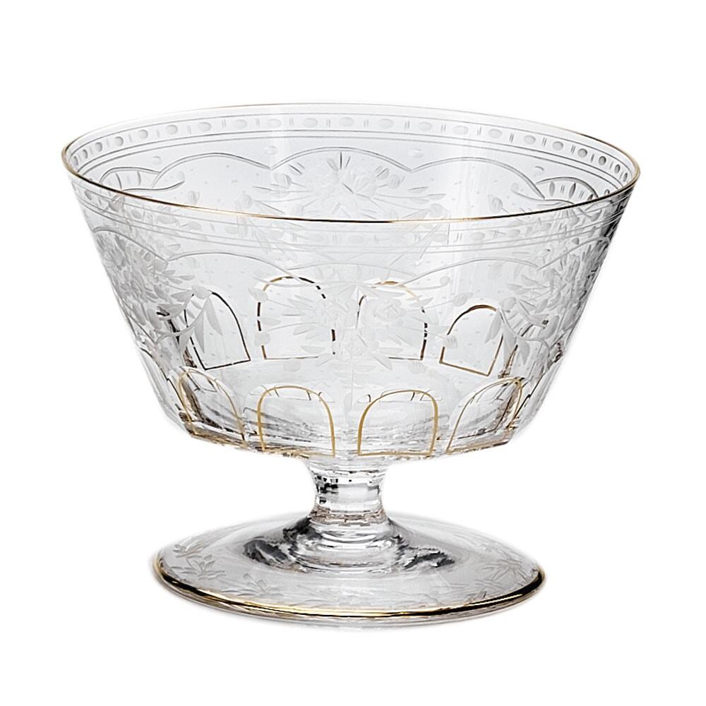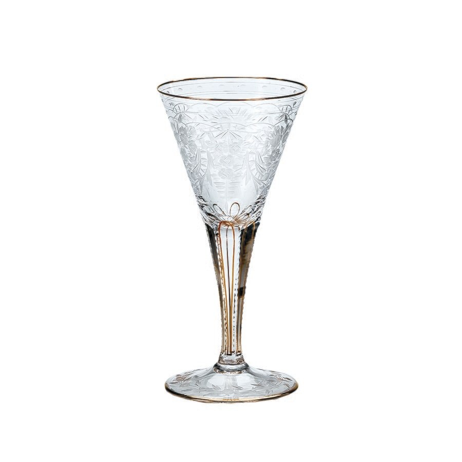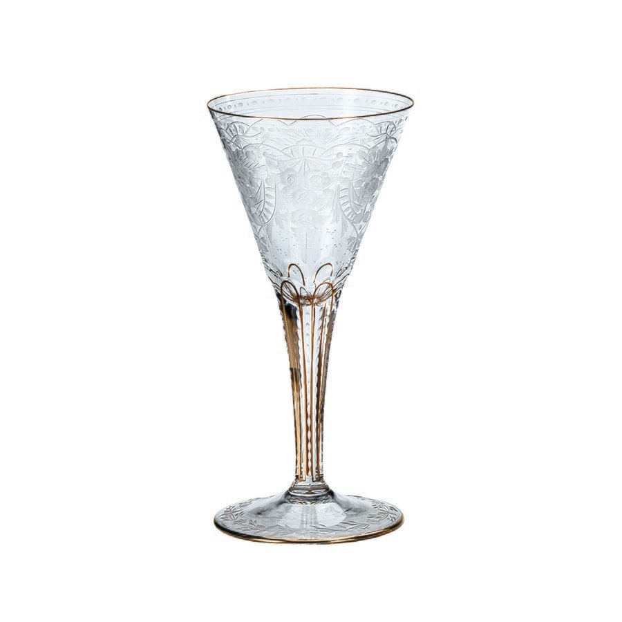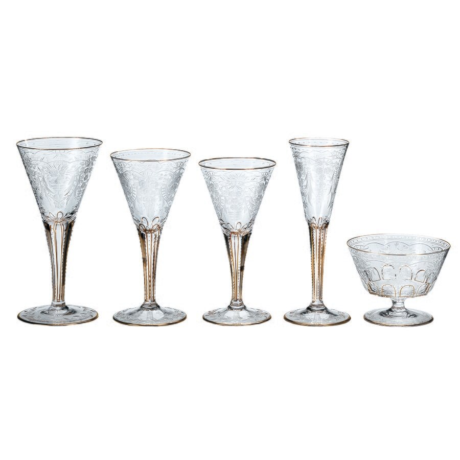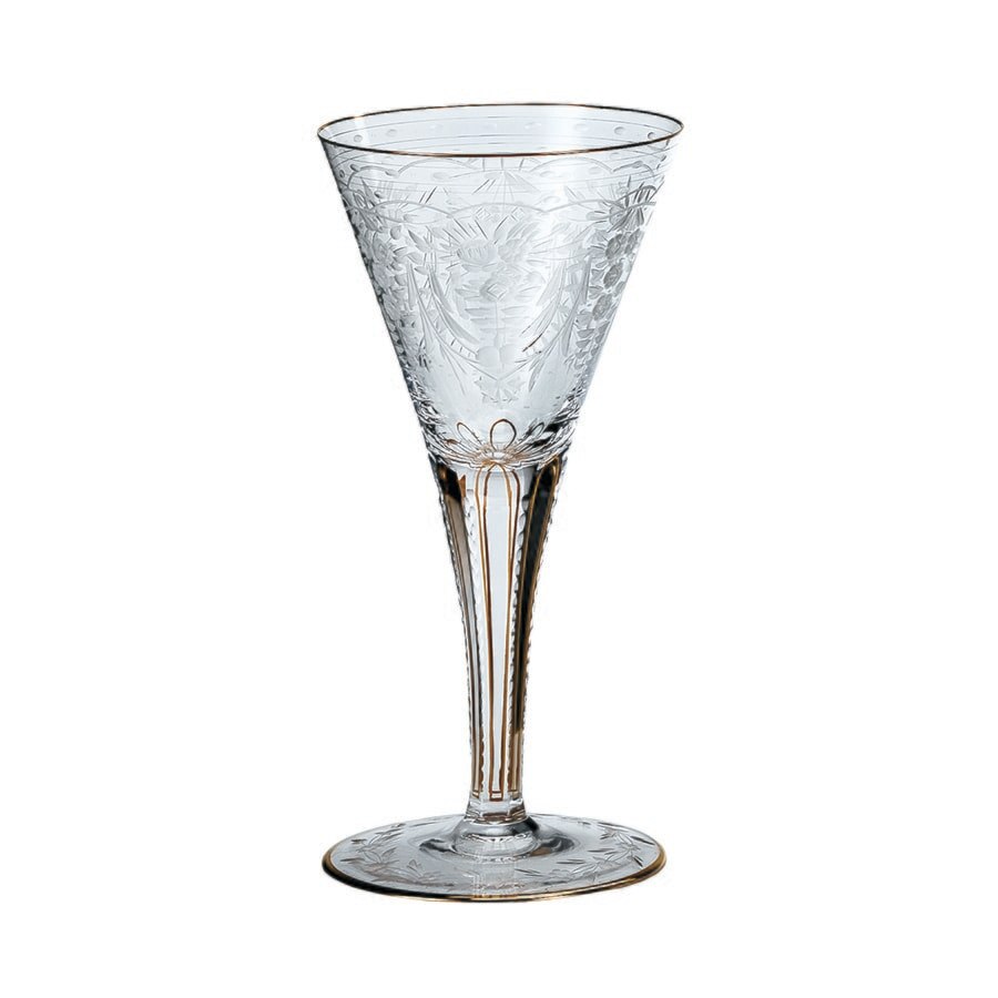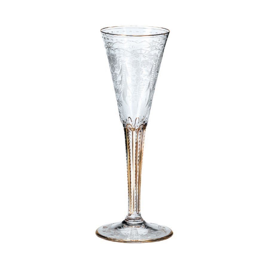 Designed around 1895, this pattern gained popularity when it was commissioned by the Maharaja of Navancore for his wife, the Maharani. Featuring cascading flora on a flute-shaped goblet, Maharani demonstrates the grandeur of the glassmaker’s art via its copper-wheel engraved motifs, pearlized-cut stems and 24K gilding.