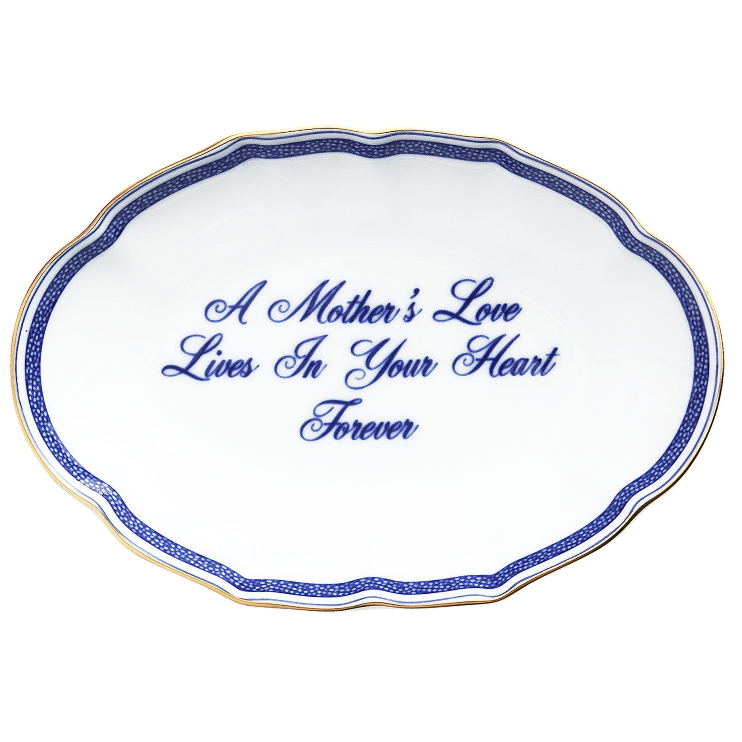 "A Mother's Love Lives in Your Heart Forever." From birth, a mother is the primary source of love, fostering that virtue in the child. Hand decorated porcelain makes a wondeful ring tray or catch.