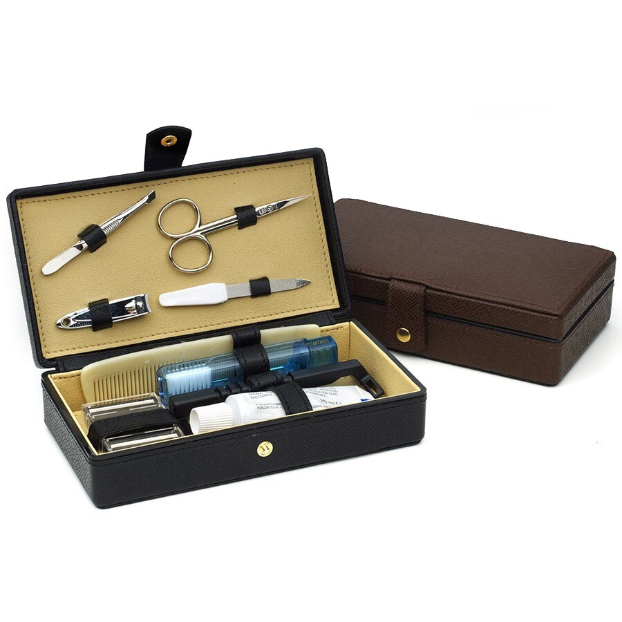 Handsome and efficient travel case has lift-out pad with razor, five blades, comb, toothbrush and toothpaste. Lid holds tweezers, nail scissors, nail clipper and nail file. 7 ¼” x 4” x 2” h. Exclusively at Scully & Scully.