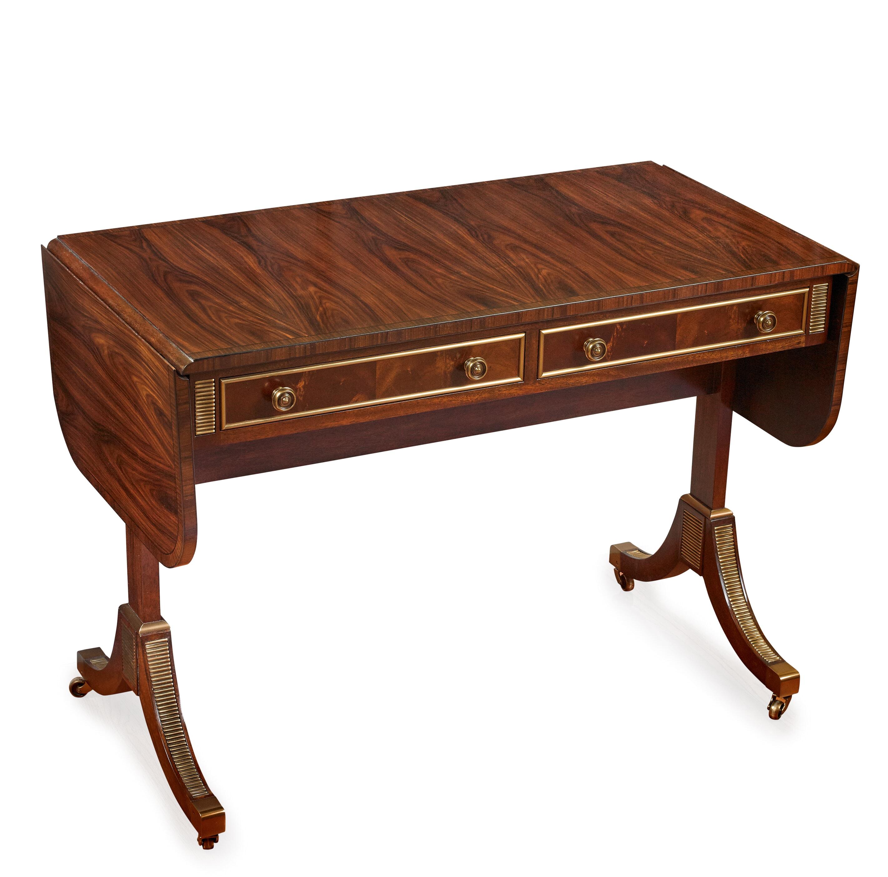 Rosewood veneered and rosewood crossbanded. Rectangular top with two rounded drop leaves with two brass handled frieze drawers flanked by reeded panels. Splay end supports with reeded brass panel inserts terminating in brass box cappings and casters.