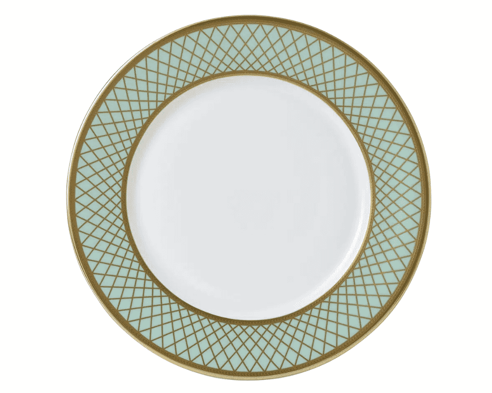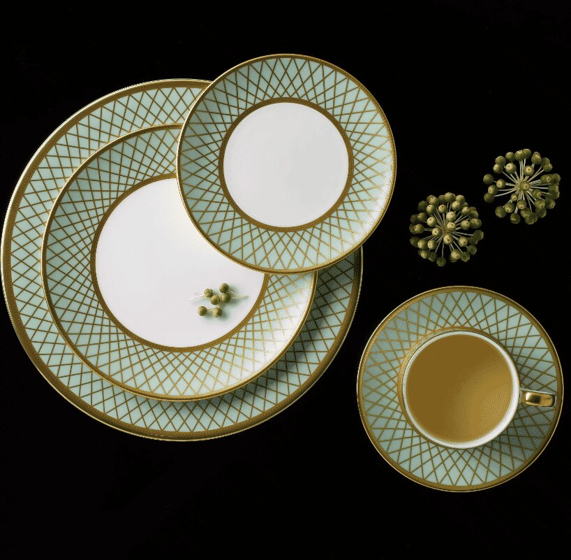 The intricate latticework on the Majestic Green collection recalls the mullioned windows of Europe's most venerated pieces of architecture. The collection is made of 22K gold and the finest bone china. Made in England. Dishwasher safe.